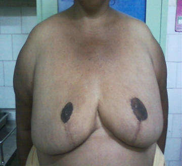 Paciente de sexo femenino, 42 años de edad, obesa, con el diagnóstico de gigantomastia, a la cual se le practicó mastoplastia reductiva con la técnica de injerto de complejo areola pezón por técnica de Thorek modificada. Solicita la reducción a una talla más cómoda para aliviar el dolor de espalda, el acanalamiento en los hombros por los tirantes del sostén y la constante humedad debajo de sus mamas. Tiene un hijo adolescente y no planea tener más hijos. Debido al gran volumen de la mama, la edad de la paciente (mayor de 40 años), consideraciones funcionales y la distancia requerida para la transferencia de pedículos, fue seleccionada esta técnica.