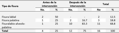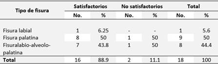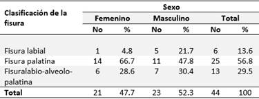 La Tabla 1 relaciona a los pacientes fisurados según clasificación de la fisura, donde las fisuras palatinas son las que con más frecuencia afectan, 25 (56.8 %).