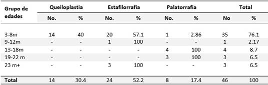 El cierre del paladar blando aislado, estafilorrafia, se realizó por lo general entre los 3 y 8 meses, mientras que el del paladar duro, palatorrafia se realizó con mayor frecuencia entre los rangos 13-18 meses de edad (8.7 %).