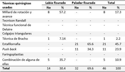 La Tabla 3 muestra las principales técnicas quirúrgicas usadas para la corrección de las fisuras bucales. De su estudio se concluyó que para el cierre del labio se usó la técnica de Millard en la mayoría de los pacientes (57.2 %). Para el cierre del paladar blando se usó la Estafilorrafia (65.6 %), la palatorrafia continuó con el método de push back en todos los pacientes (34.3 %).