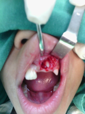Previo consentimiento informado, y una vez realizadas la valoración clínica y radiográfica correspondiente, se inició la extracción quirúrgica del odontoma compuesto.