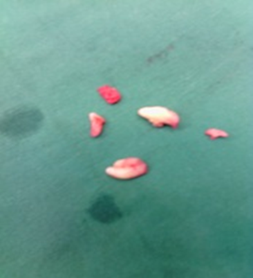 Se realiza exposición y extracción de 5 piezas macroscópicamente similares a dientes microdónticos, de forma ordenada y de diferentes tamaños (Figura 3), lo que permite dar un diagnóstico intraquirúrgico de odontoma compuesto.