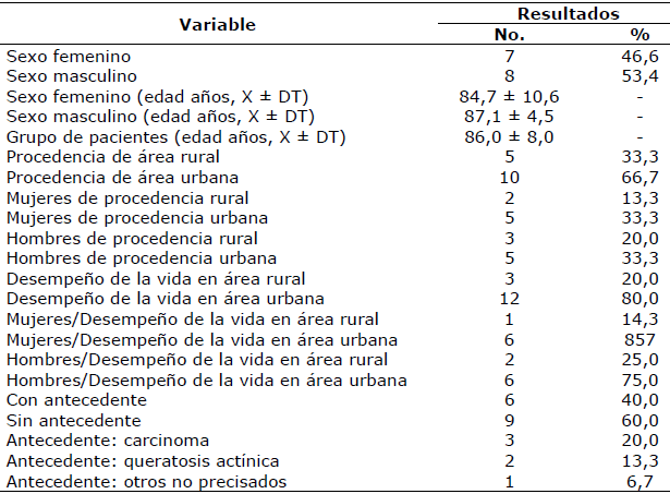 En la Tabla 1 se precisa que la edad de los pacientes fue de 86,0 ± 8,0 años, los hombres fueron más longevos. El mayor porcentaje de ellos nació (66,7 %) y desarrolló su vida en áreas urbanas (80,0 %). Solo el 40,0 % refirió de lesión precancerosa o neoplásica de la piel y el más común fue el carcinoma (20,0 %).