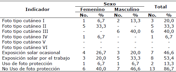El mayor porcentaje de los pacientes tenía una foto tipo cutáneo III (40,0 %), Tabla 2. En las mujeres fue más común el fototipo II (71,4 %) y en los hombres el foto tipo III (62,5 %). El 100,0 % refirió haberse expuesto en la luz solar en algún momento de su vida, el 46,6 % de modo ocasional y el 53,4 % por necesidades laborales; la mayoría (86,7 %) refirió no haber usado algún tipo de foto protección.