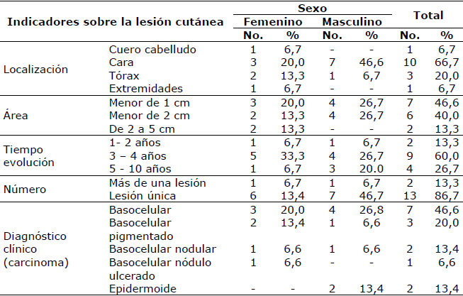 Resultados: en el 5,9 % de los ancianos se diagnosticó un cáncer de piel. Fue más común en hombres (53,4 %), con 70 a 79 años (53,4 %), nacidos o que vivieron en áreas urbanas y foto tipo cutáneo III (40,0 %). El 100.0 % se expuso a la luz solar, el 86,7 % sin medios de foto protección. El cáncer se localizó más en la cara (66,7 %), tenía un área inferior a un centímetro (46,6 %), entre 3 y 4 años de evolución (60,0 %), fue una lesión única (86,7 %) y el carcinoma basocelular (46,6 %). En el 80,0 % de los casos se apreció correlación diagnóstico clínica-dermatoscópica.