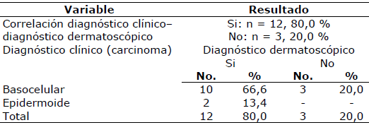 En la Tabla 4 se muestra que en el 80,0 % de los pacientes se logró la correlación diagnóstico clínico-diagnóstico dermatoscópico.