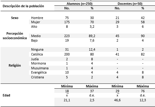 En ambos grupos más de la mitad de los participantes eran mujeres. Con respecto a la percepción socioeconómica el 89,2 % de los alumnos (n=223) y el 90 % de los docentes (n=45) se ubicaron dentro de un nivel socioeconómico medio. La mayoría de los alumnos y los docentes profesan la religión católica (80 % vs 82 %). (Tabla 1)