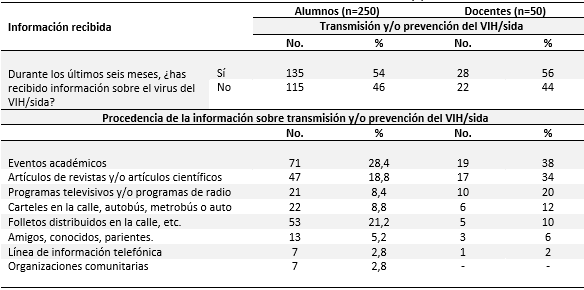 Del total de los docentes y alumnos que participaron en el presente estudio, un poco más de la mitad recibió información sobre transmisión y/o prevención del VIH/sida durante los últimos 6 meses. Los métodos de información más comunes fueron los eventos académicos y los artículos científicos. En el caso de los alumnos, los folletos distribuidos en las calles, también resultó una vía frecuente de información. (Tabla 2)