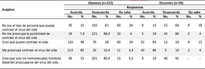 Method: it was a descriptive observational study. 250 students and 50 FEBUAP teachers were included, with prior voluntary acceptance and signed informed consent, selected by means of a convenience sample. The HIV/AIDS-65 scale was applied, an instrument with proven validity and reliability for the evaluation of the subscales of the instrument (Cronbach alpha 0.79), proposed by Paniagua in 1998 and adapted to Spanish by Bermúdez, Buela-Casal & Uribe in 2005.