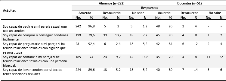Con respecto a la autoeficacia, los alumnos denotaron una ligera superioridad. La mayoría de ellos consideraron ser capaz de solicitar a su pareja el uso del condón. La facilidad para comprar un condón fue mayor en los docentes. El preguntar y confiar a la pareja el haber tenido relaciones de riesgo fue mayor en los alumnos. Finalmente, el llevar condón en caso de tener una relación sexual fue mayor en los alumnos. (Tabla 4)