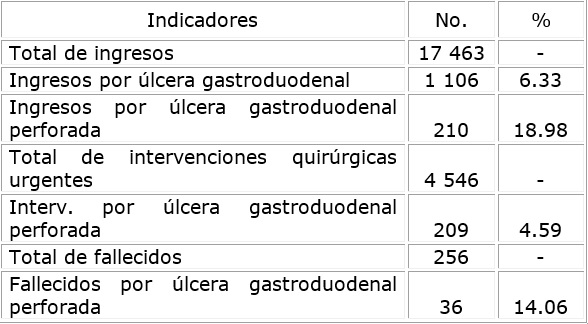 Como se puede apreciar la morbilidad y mortalidad global del servicio de cirugía general en el periodo de tiempo estudiado (2001-2010), se encontró que hubo un total de 17463 ingresos, de estos 1106 (6.33 %) por úlceras gastroduodenales y 210 (18.98 %) de ellas por perforación. De un total de 4 546 operaciones urgentes, 209 (4.59 %) fueron por úlceras gastroduodenales perforadas. De 256 fallecidos, 36 (14.06 %) fueron por úlceras gastroduodenales perforadas (Tabla 1).