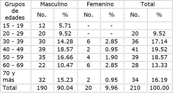 El mayor porcentaje de pacientes estudiados estaban comprendidos en las edades medias y avanzadas de la vida; La edad promedio de los pacientes estudiados fue de 50 años y un rango entre los 15 y 85 años, similares resultados encontraron otros autores 8,9,10, lo que corrobora que el accidente perforativo aparece en los periodos en que el ser humano despliega una mayor actividad productiva y desempeña importantes funciones en el desarrollo social, momentos en que el estrés está presente y los procesos ulcerosos tienen un largo periodo de evolución que unido a otras condicionantes favorecen el estadio de su perforación.