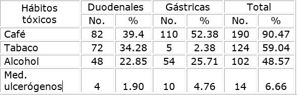 Esta forma de tratamiento fue iniciada por Wangesteen e impulsada por Taylor. De los hábitos tóxicos el café fue el más hallado, seguido del tabaco, el alcohol y los medicamentos llamados “ulcerógenos" con predominio en los pacientes con úlceras duodenales; similares datos refieren otros estudios revisados.9,12,16Chalya16 informa un caso perforado con betametasona.