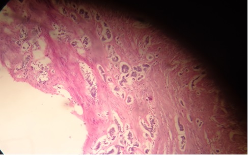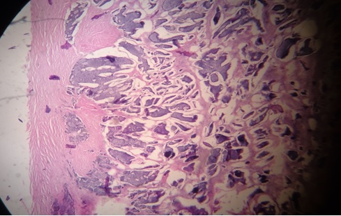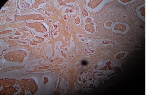 Las células neoplásicas forman islotes, bandas cordones y sabanas. Son similares con escaso citoplasma granular eosinófilo y núcleo redondo. Las células contienen gránulos de secreción bien formados y rodeado de membrana osmófilo (gránulo de núcleo denso) por coloración especial se demostró gránulos argentófilos (Figuras 1,2 y3).