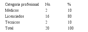 Concluida la investigación se obtuvo los siguientes datos (Ver Tabla 1), la categoría profesional licenciados predominó con un 80 %, al constituir el mayor número de trabajadores de los laboratorios de Microbiología, en menor cuantía se encuentran los técnicos y luego los médicos, resultados que coinciden con los patrones de trabajadores de los laboratorios en cuestión.