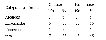 Al analizar el nivel de conocimientos acerca del diagnóstico microbiológico de la Gardnerella vaginalis, se obtiene que el 65 % de los encuestados desconoce los elementos del diagnóstico, para un 55 % representado por los licenciados, con igualdad porcentual se encuentran los médicos y los técnicos con el 5 % en ambos casos (Tabla 2).
