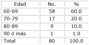 El grupo etario de mayor incidencia en la consulta fue el de 60-69 con un 60.0 % (Tabla 1).