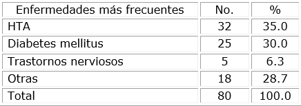 La hipertensión arterial (HTA) tiene un predominio importante dentro de las enfermedades presentes en éstos pacientes seguida de la diabetes mellitus (DM). Celso Suárez Lescay plantea en su trabajo “Índice de pene brazo en el diagnóstico de la disfunción sexual eréctil” que las principales condiciones asociadas resultaron ser la hipertensión arterial y el hábito de fumar10. El trabajo “Pesquisa de disfunción eréctil”del Dr. Torres Fuentes encontró la hipertensión arterial como la principal enfermedad crónica en estos pacientes.11