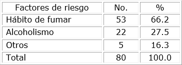 Entre los factores de riesgo más frecuentes se encuentran en primer lugar el hábito de fumar con el 66.2 % (Tabla 3).
