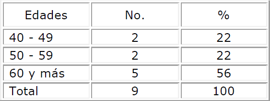 En la distribución de pacientes según grupos de edades (Tabla 1) se encontró que el 56 % de los pacientes se incluye en el rango de 60 años y más.
