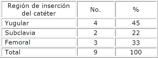 En la distribución de pacientes según el sitio de inserción del catéter (Tabla 2) el 45 % de los pacientes tenía el catéter implantado en la región yugular.