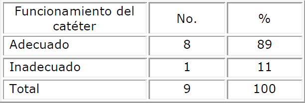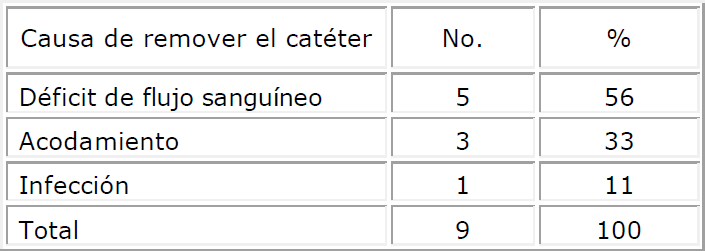 El 56 % de los catéteres fueron retirados por déficit de flujo sanguíneo (Tabla 4), seguido del acodamiento (33 %) y solo uno fue retirado por sepsis demostrada mediante el cultivo de la punta del mismo.