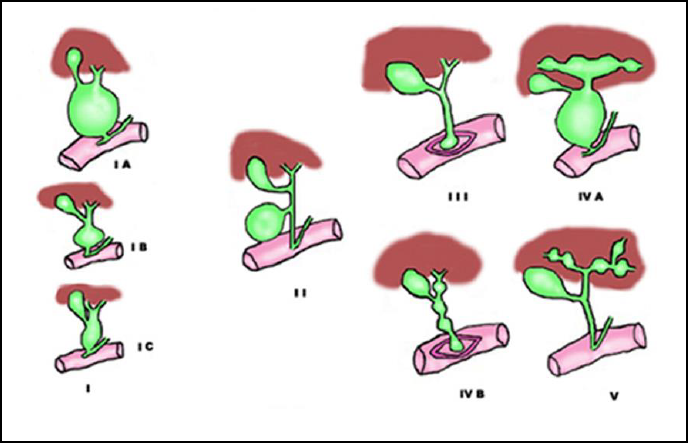 Tipo I: quística; tipo II: diverticular; tipo 3: coledocele; tipo IV A: dilatación de las vías biliares intra y extrahepática; tipo IV B: dilatación de las vías biliares extrahepática; tipo V: dilatación de las vías biliares intrahepáticas (enfermedad de Caroli).