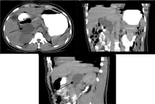 En el corte axial, coronal y sagital se observa el quiste del colédoco señalado por una flecha.