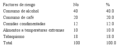 Se puede constatar en la Tabla 2 que muestra los pacientes según factores de riesgos, se pudo constatar que el mayor porcentaje de los pacientes tenían asociado el consumo de alcohol como factor de riesgo con 40 (40.0 %).