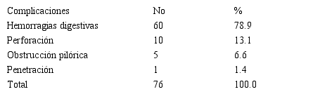 Fuente: historia clínicaAl identificar las principales complicaciones como se aprecia en la Tabla 3, se constató predominio de las hemorragias digestivas con 60 pacientes (78.9).
