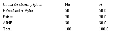 Fuente: historia clínicaComo muestra la Tabla 4, los pacientes según causa de úlcera péptica, se puede constatar la infección por Helicobacter Pylori como causa fundamental con 50 (50.0 %). Estos resultados coinciden con los reportados en las literaturas que reportan resultados similares..