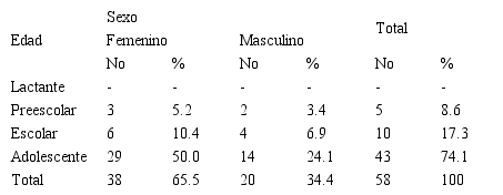 En la Tabla 1, donde se distribuyen por grupos de edades y sexo; teniendo en cuenta la edad podemos observar que la diferencia entre los grupos etarios es significativa, predominando los adolescentes con un número de casos de 43 para un 74.1 %, seguido por los escolares 10 (17.3 %) y los preescolares con 5 (8.6 %), no encontrándose lactantes en este estudio. En cuanto a la variable sexo predominó el masculino con 38 (65.5 %).