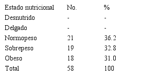 Fuente: Planilla de vaciamientoEn la Tabla 2 se distribuye el estado nutricional, se observa que el 63.8 % estaban distribuidos en los rangos de sobrepeso y obesos.
