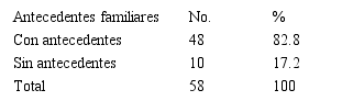 Fuente: Planilla de vaciamientoCon respecto a los antecedentes familiares de hipertensión arterial (Tabla 3), se observa que el 82.8 % tenían antecedentes, mientras que el 17.2 % carecía de ellos.