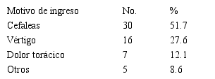 Fuente: Planilla de vaciamientoLa Tabla 4 refleja las manifestaciones clínicas que presentaron los pacientes al momento del ingreso o que les motivó ir al hospital, siendo la cefalea la más frecuente con 30 pacientes (51.7 %), el mareo estuvo presente en el 27.6 % de los pacientes, el dolor torácico en el 12.1 % de los mismos y la presencia de otros síntomas en un 8.6 %.