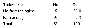 Fuente: Planilla de vaciamientoEn esta Tabla 5 se observa que 39 pacientes no recibieron tratamiento farmacológico, lo que representa el 32.8 %, mientras que el 67.2 % restantes si lo recibieron.