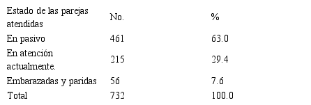 La dinámica de la consulta plantea tendencia al incremento de los casos a atenderse y mantenerse en la misma hasta el logro del embarazo. Se logró embarazo en el 37 % de las parejas, con predominio de las de más de 3 años de infertilidad; y el parto en el 41.0 % de estas embarazadas.