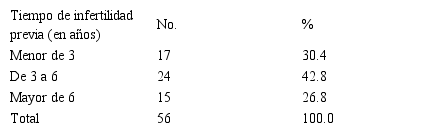 De acuerdo con esos datos, el valor promedio de la duración de la infertilidad en las pacientes de este estudio representa un factor pronóstico negativo en cuanto a la posibilidad de embarazo. En el 52 % de las pacientes, la duración de la infertilidad era mayor de 36 meses, tiempo a partir del cual se ha señalado que el embarazo es menos probable.12