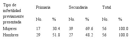 Fuente: EncuestaLa Tabla 3, muestra que en las parejas atendidas predominaron las mujeres con infertilidad secundaria (69.6 %) y en los hombres con infertilidad primaria (51.8 %). El 57.7 % de las mujeres tenía infertilidad primaria, y el 52 % presentó un tiempo de infertilidad mayor de 36 meses.