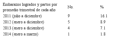 Fuente: EncuestaSe observa en esta Tabla 4, como los embarazos logrados y los partos de las parejas atendidas, ha ido decreciendo trimestralmente desde el tercer trimestre del 2011 hasta el primer trimestre del 2014.