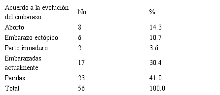 Fuente: EncuestaPor último, la Tabla 5, muestra que de las mujeres que lograron su embarazo, el 41.0 % ya tuvieron su parto y el 30.4 % se encuentran actualmente embarazadas; cifras éstas muy superiores a las que no lograron una evolución favorable (28.6 %). Dos embarazos fueron ectópicos, ambos tubáricos (5.1 %) y en pacientes sin factores aparentes de riesgo en esta entidad. Seis pacientes abortaron (15.6 %) y todas antes de la décima semana de gestación. La mitad del total de estas pacientes ya habían abortado espontáneamente al menos una vez.