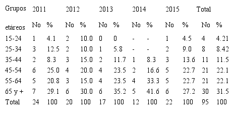 Al analizar los grupos de edades (Tabla 1), se observó que la mayor proporción de casos se presenta en la sexta década de vida; seguida de la cuarta y quinta décadas favorecido esto por las condiciones socioeconómicas, factores de riesgo y mayor susceptibilidad de estas personas a las infecciones.