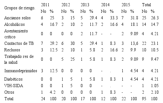 Los pacientes de la tercera edad constituyeron el grupo más afectado, los ancianos solos, los alcohólicos y los reclusos constituyeron los factores de riesgo que más prevalecieron. La forma clínica que predominó fue la pulmonar y se constató demora en diagnóstico.