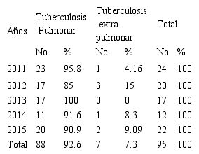 Se observó un predominio de la forma pulmonar (Tabla 3), que alcanzó 93.4 % en el 2011 debido a que es la forma clínica más frecuente y los factores de riesgo inciden más directamente en las personas haciéndolas más vulnerables, más fácil el diagnóstico y menos invasivo el proceder.