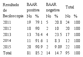 En los resultados de la baciloscopía, primó el diagnóstico de bacilos ácido-alcohol-resistentes (BAAR) positivo con mayor porcentaje en el 2011, con 79.2 % como se muestra en la Tabla 4, develando un deficiente funcionamiento del programa, donde existe baja percepción del riesgo y pobre pesquisa en los grupos de riesgo.