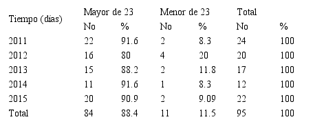 Fuente: Dpto. de estadísticas CPHEM Guantánamo.El tiempo que medió entre los primeros síntomas y el diagnostico se incumplió como se refleja en la tabla 5, debió ser en un tiempo menor de 23 días como lo establece el programa, el mayor por ciento de los casos sobrepasó este límite (53 casos (86.8 %).