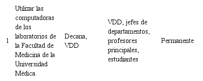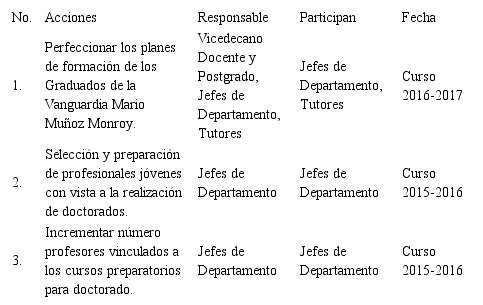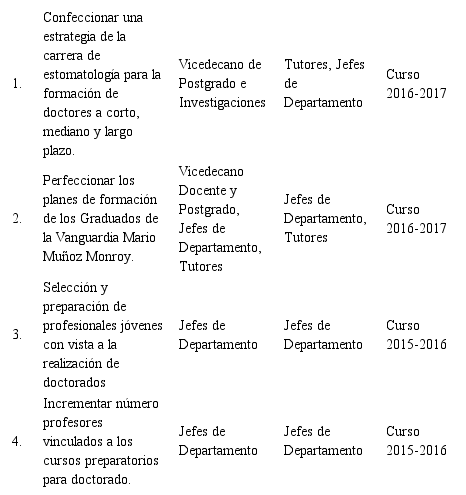 A partir de las variables con dificultad y los resultados de las autoevaluaciones realizadas preliminarmente por los escenarios, departamentos que tributan a la carrera y los miembros de la comisión encargada del proceso de autoevaluación para la acreditación de la carrera, proyectan que existen en estos momentos debilidades en las que nos tenemos que afanar para perfeccionar el trabajo y la calidad de los procesos docentes asistenciales para merecer así tal distinción. Plan de mejora elaborado por la dirección de la carrera.