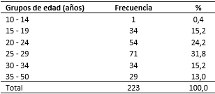La edad promedio fue 26,4 años de edad (con una desviación típica de 6,4 y coeficiente de variación 0,2) que hace referencia a una muestra no homogénea con respecto a la edad (Tabla 1).