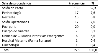 En la tabla 2 se muestra que el mayor porcentaje de las pacientes atendidas en la Unidad de Cuidados Intensivos procedió del Salón de Parto, para un 62,3%.