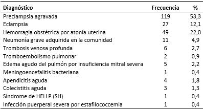 Al analizar los diagnósticos que determinaron el ingreso de estas pacientes, tabla 3, se tiene que los trastornos hipertensivos inducidos por el embarazo (preclampsia agravada con 53,3 % y eclampsia con 12,1 %) y la hemorragia obstétrica para un 22,0 %, fueron las enfermedades que prevalecieron.